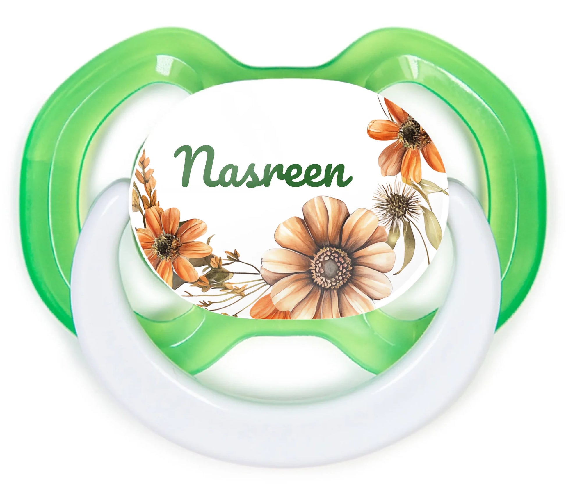 We use a process called UV Ink Jet Printing, where we print directly onto the plastic back of the pacifier, and use a UV light to cure the print. This allows for a highly customizable product, with full color and high quality.
