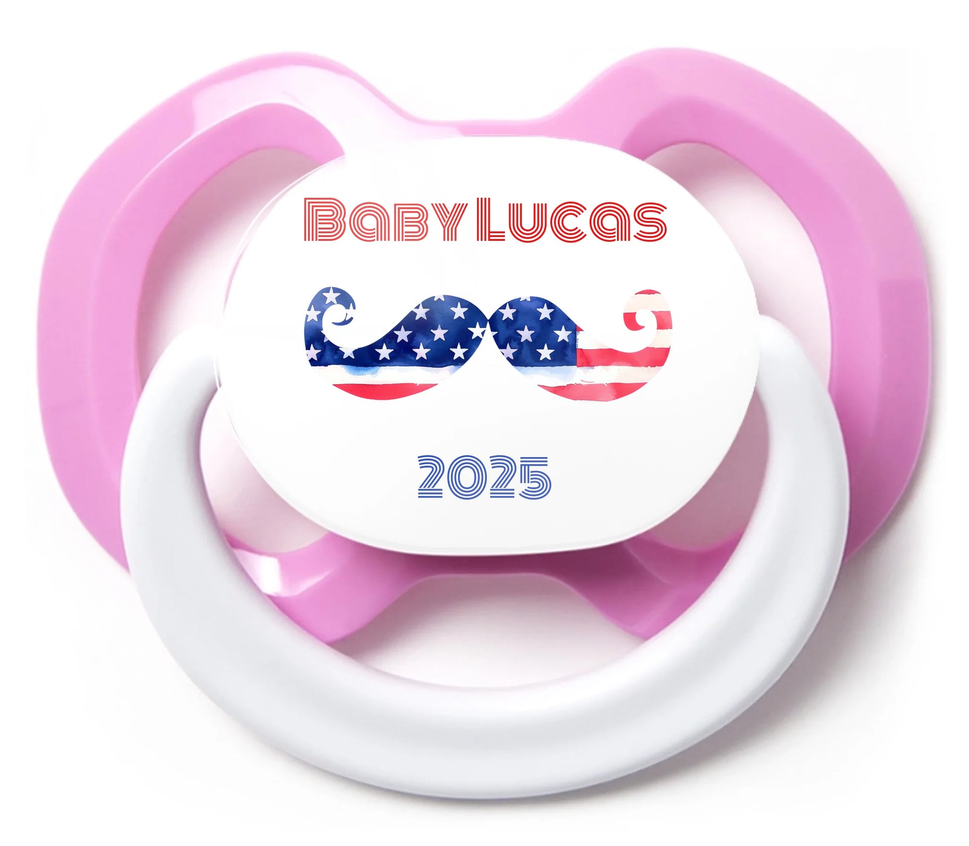 We use a process called UV Ink Jet Printing, where we print directly onto the plastic back of the pacifier, and use a UV light to cure the print. This allows for a highly customizable product, with full color and high quality.